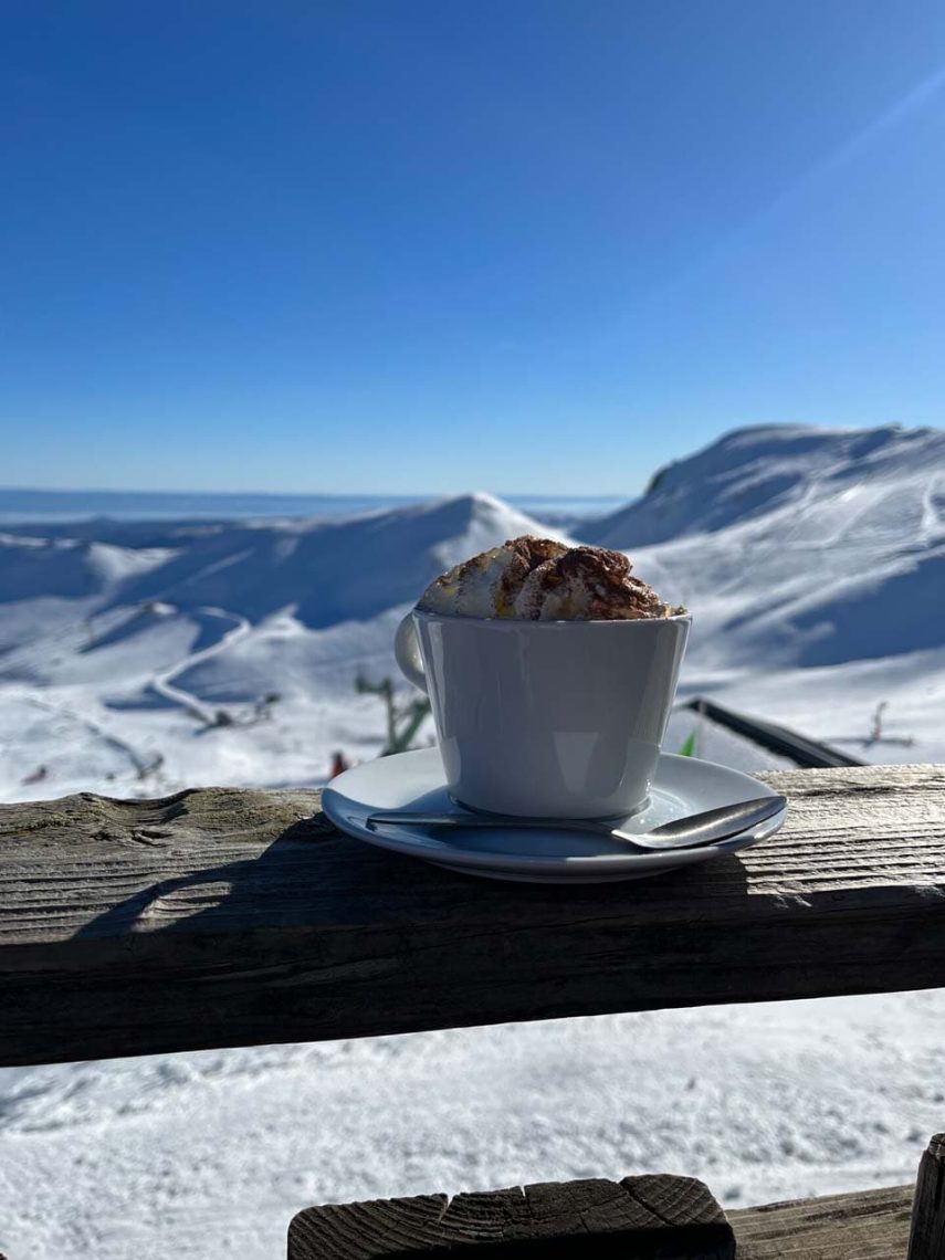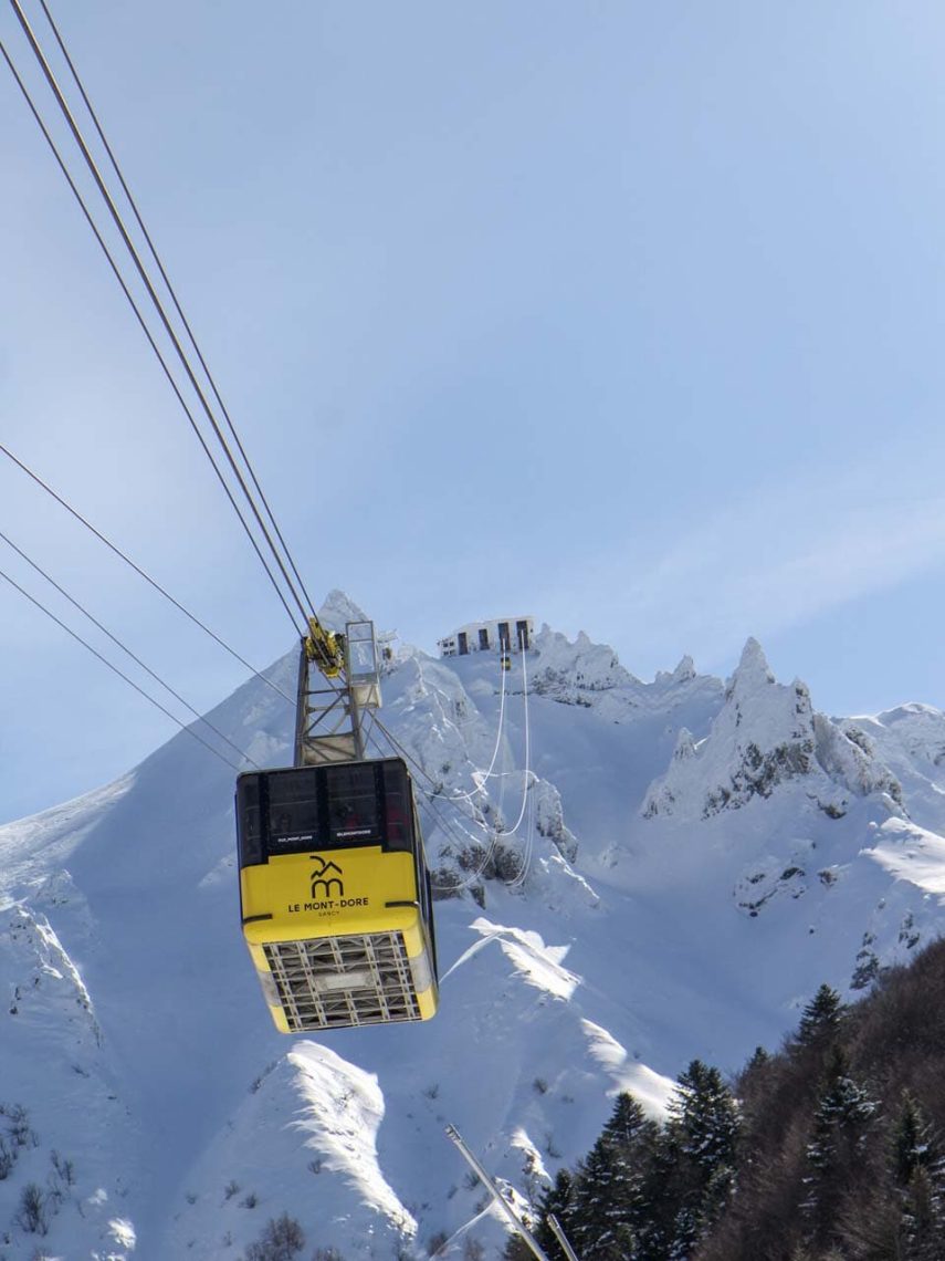 Le moyen le plus simple d’accéder au plus haut panorama du Sancy en hiver est de monter à bord du téléphérique du Sancy, au départ de la station de ski du Mont-Dore. À l’arrivée, on vous recommande une crêpe à la confiture de myrtilles et un chocolat chaud chantilly 🤗 en terrasse !
