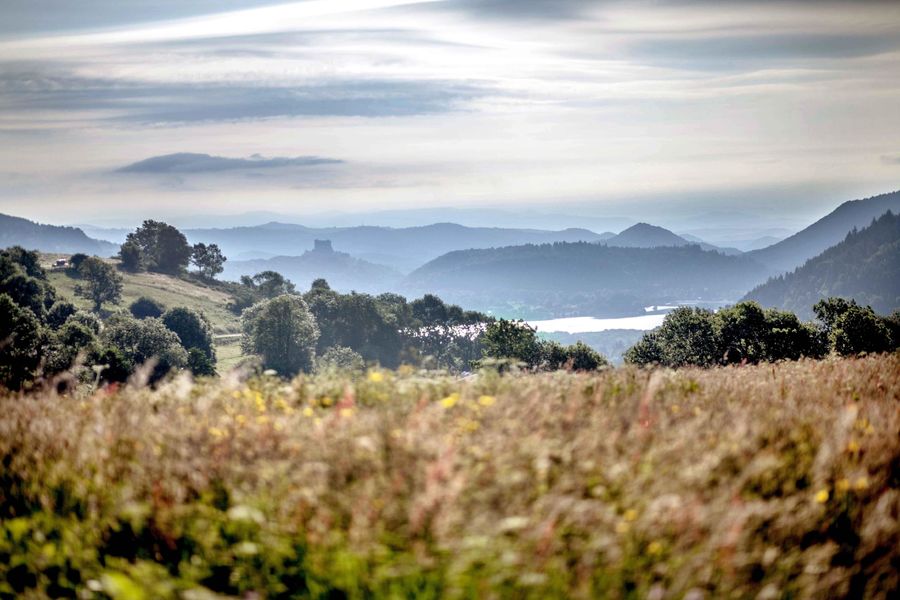 Étape 1 : Du panneau de départ situé place de la Fontaine suivre la rue des Forges ; après le pont, prendre à gauche la route Chemin du Moulin qui longe le ruisseau, passer le pont et poursuivre sur la route à flanc de montagne (vue sur Chambon-sur-Lac et le lac). Au hameau Les Angles, aller à gauche puis à droite. À l’intersection à la sortie du village, emprunter en face le chemin (croix) jusqu’à la route (vue sur le château de Murol et le lac).