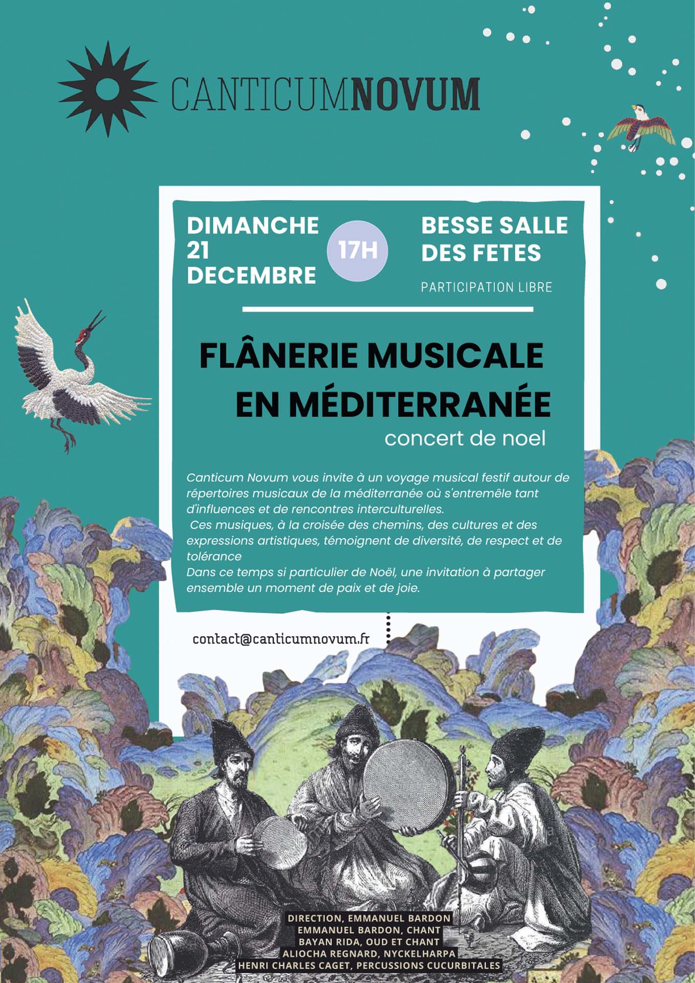 Canticum Novum vous invite à un voyage musical festif autour de répertoires musicaux de la méditerranée ou s’entremêle tant d’influences et de rencontres interculturelles. Ces musiques, à la croisée des chemins, des cultures et des expressions artistiques, témoignent de diversité, de respect et de tolérance. Dans ce temps si particulier(…)
