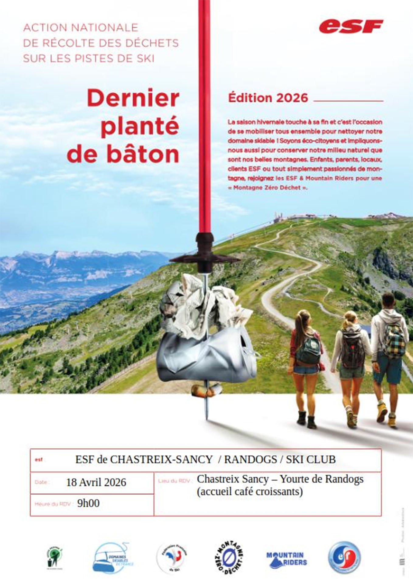 La saison hivernale touche à sa fin et c’est l’occasion de se mobiliser tous ensemble pour nettoyer notre domaine skiable. Soyons éco-citoyens et impliquons nous aussi pour conserver notre milieu naturel que sont nos belles montagnes. Enfants, parents, locaux, clients ESF ou tout simplement passionnés de montagne, rejoignez les ESF & Mountain Riders pour une « Montagne Zéro Déchet ». N’oubliez pas vos gants et sacs poubelles, nous nous chargeons du café et des croissants !