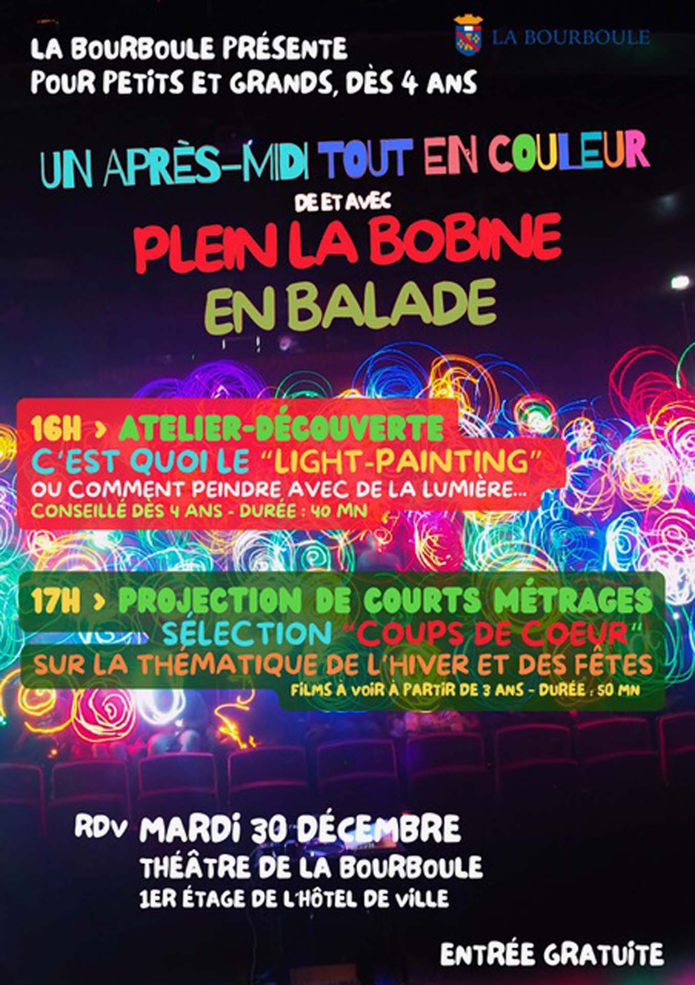 – de 16 h à 17 h : atelier de light painting , la « peinture de lumière » . Seuls ou en famille, venez exprimer votre créativité tout en étant sensibilisés aux principes photographiques.