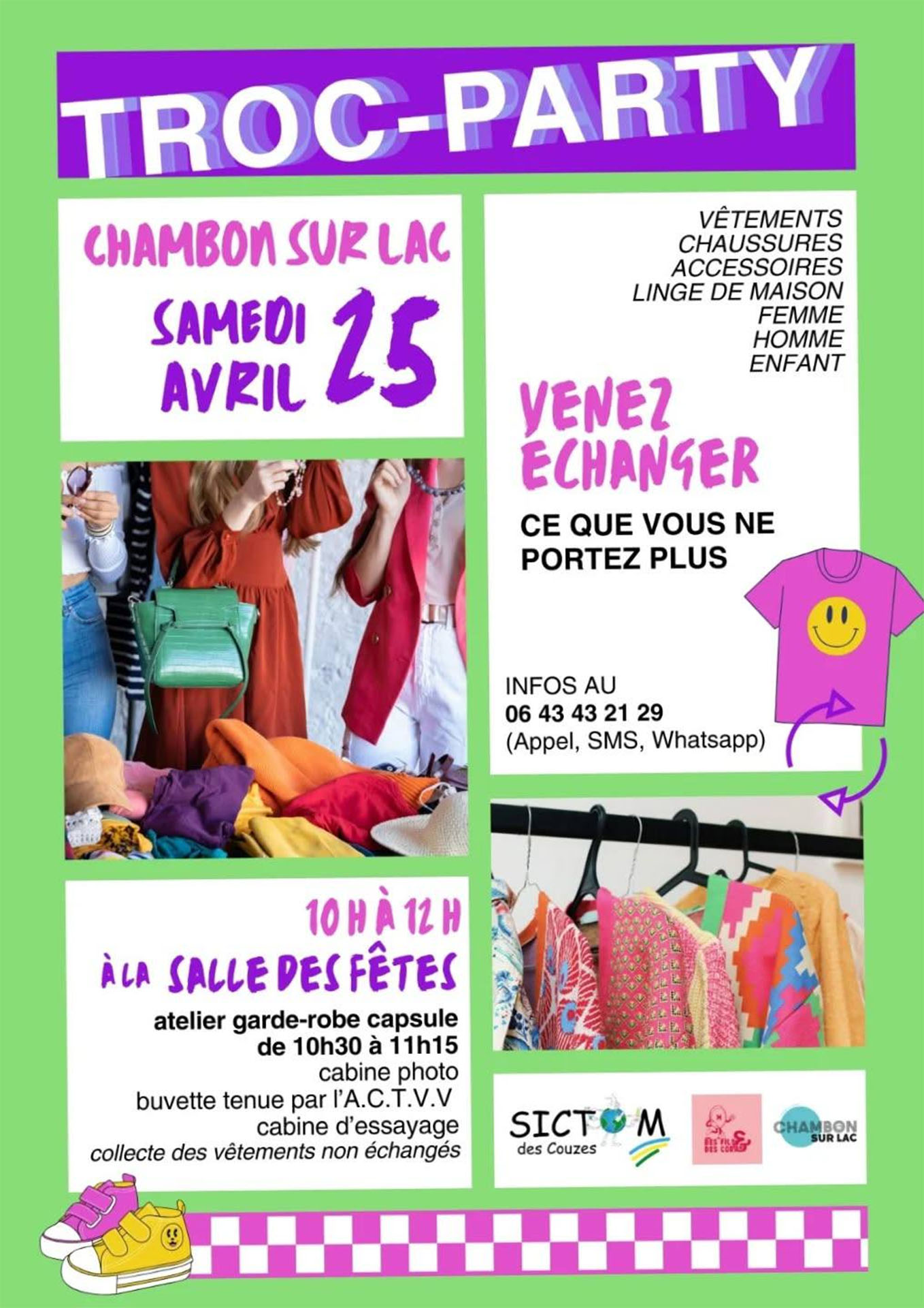 Profitez d’un atelier garde-robe capsule de 10h30 à 11h15, d’une cabine photo et d’une cabine d’essayage. Une buvette tenue par l’A.C.T.V.V sera également disponible. Une collecte des vêtements non échangés sera organisée à la fin de l’événement.