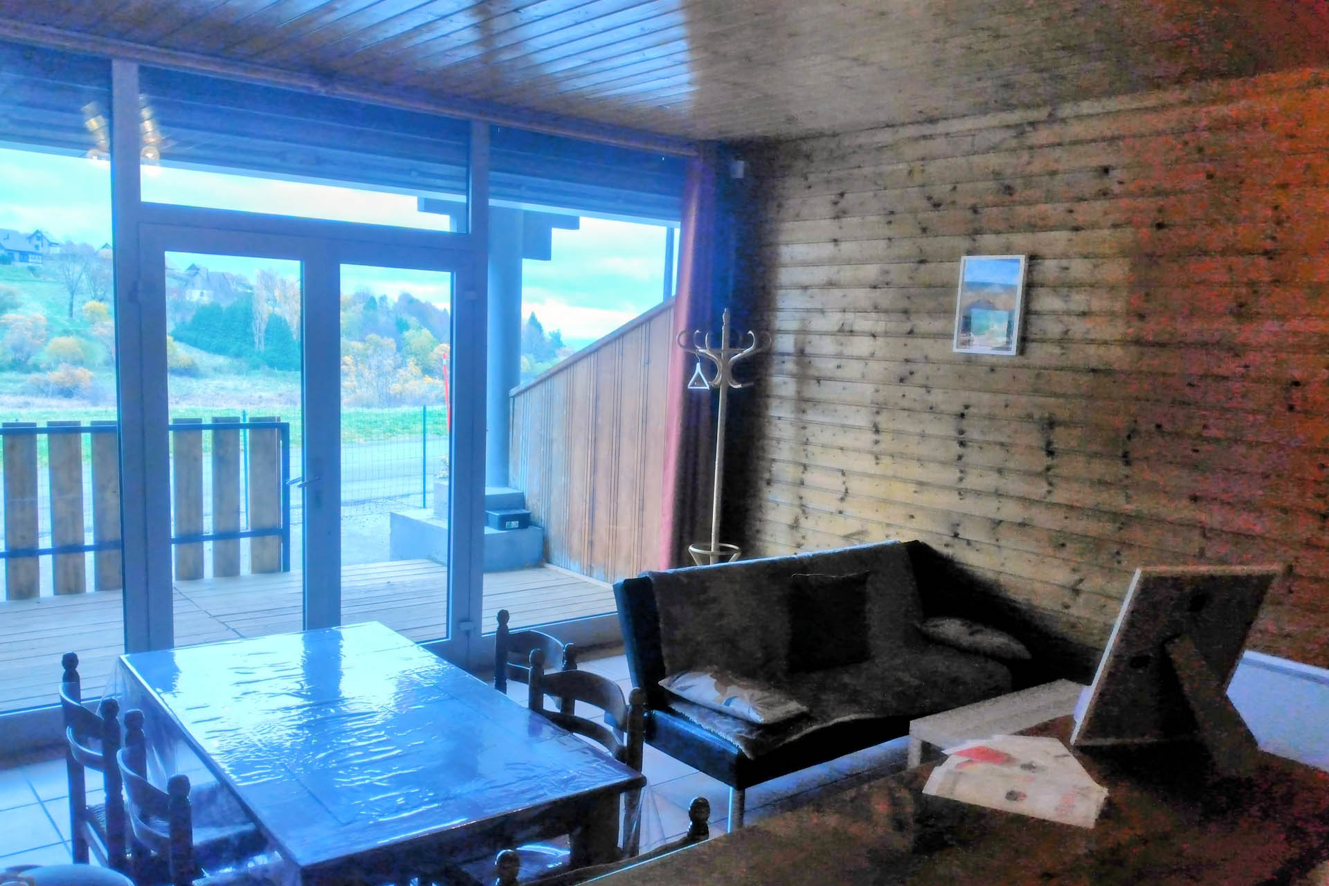Au rez-de-chaussée de ce logement »Sérénité » se trouve une grande pièce de vie d’environ 30m2 avec son coin cuisine (plaques de cuisson), son salon (canapé convertible) et son coin repas. Une terrasse attenante offre une vue dégagée sur la vallée. On y trouve aussi une salle d’eau/WC.