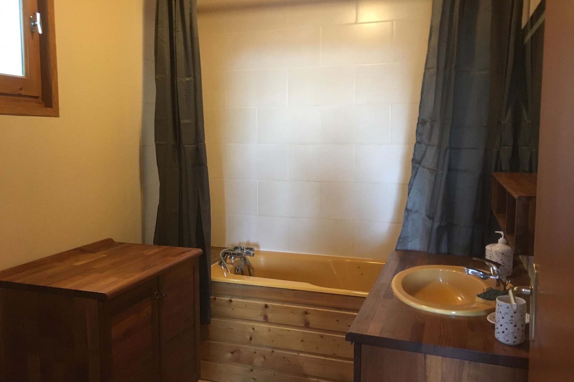 Un rez-de-chaussée : une entrée, un rangement à skis, un lave-linge, un sèche-linge