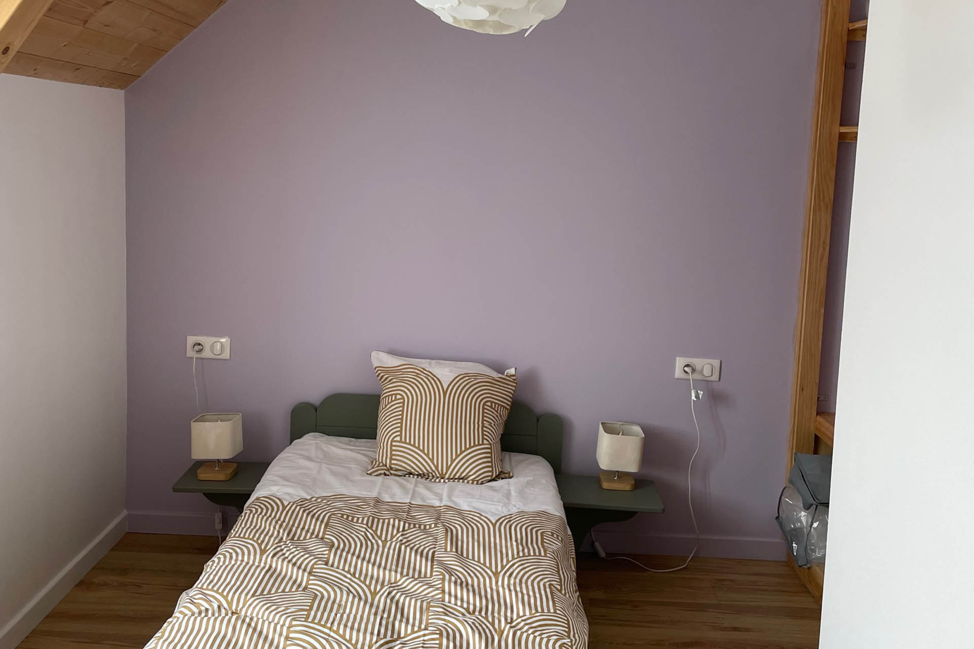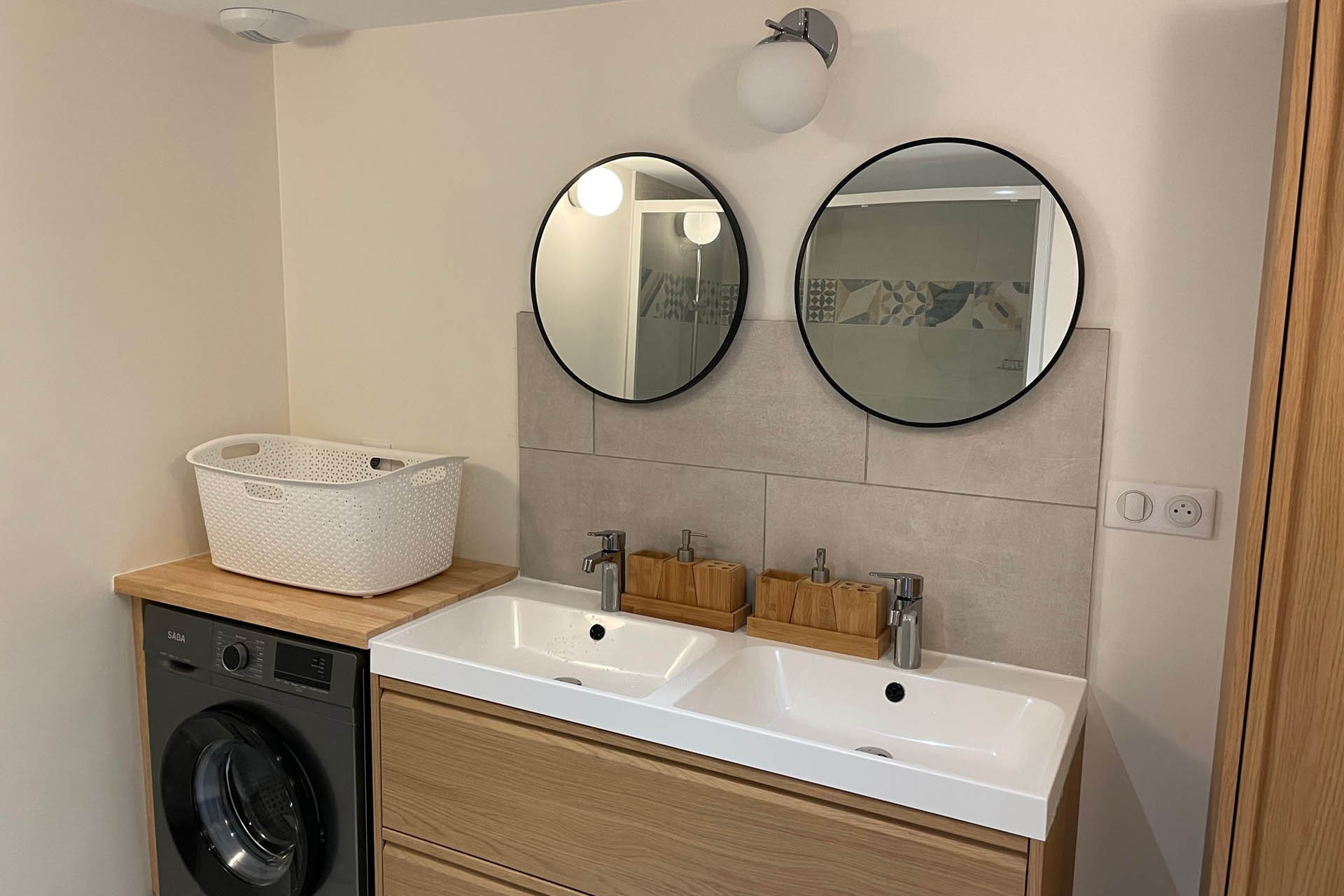 Entrée indépendante, pièce de vie séjour- cuisine entièrement équipée, WC, salle de bain et deux chambres, place de stationnement.