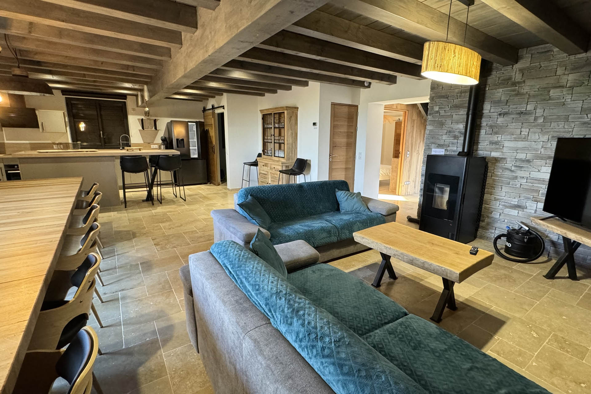 Grand séjour plein sud, écran plat avec 2 canapés et superbe vue sur les monts du Cantal