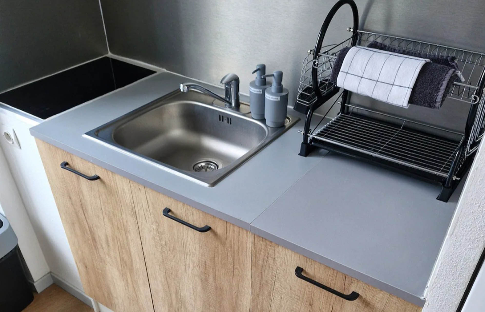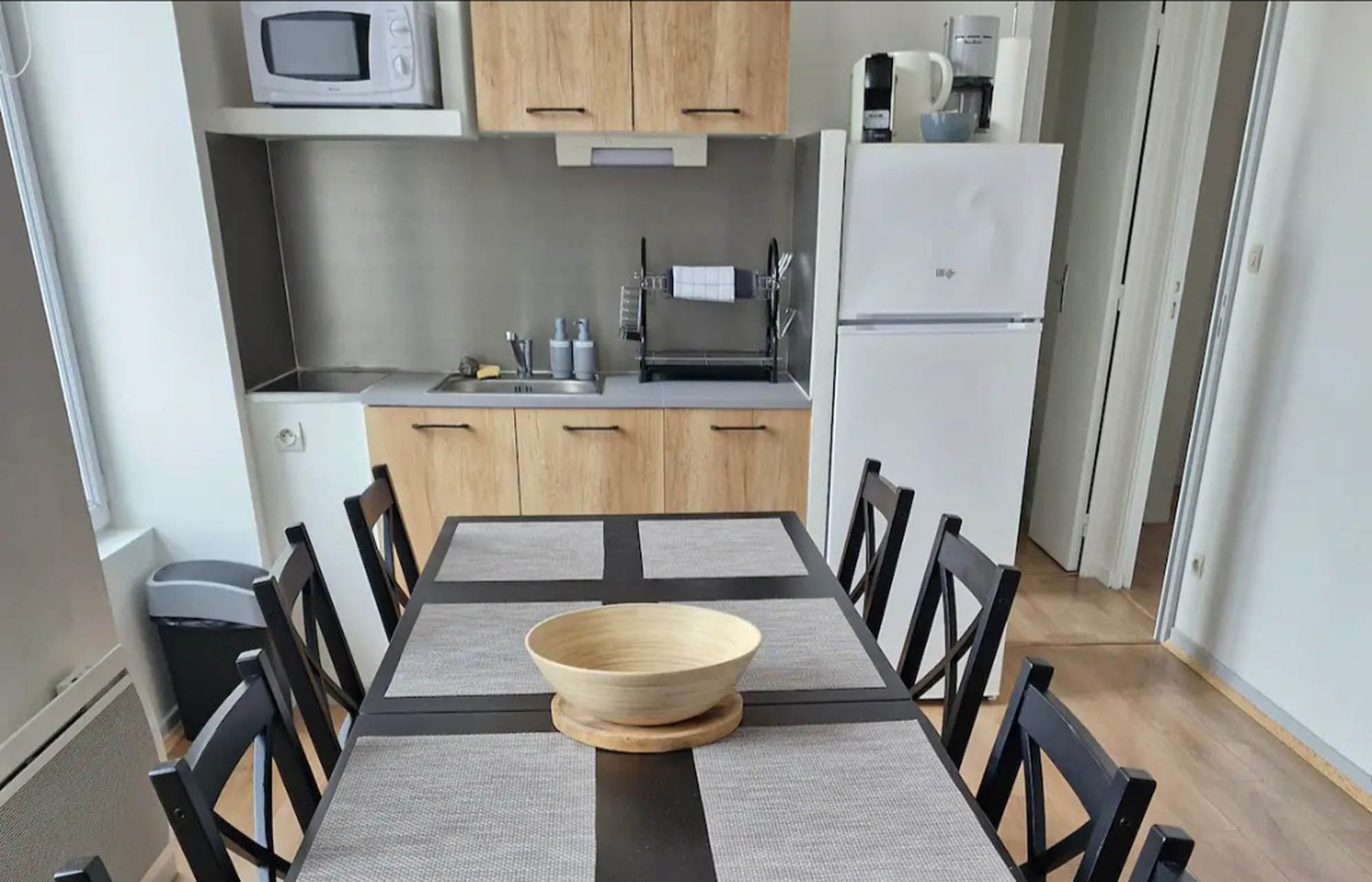 Une grande pièce à vivre de + 20m2, avec une cuisine équipée (micro-ondes / cafetière / bouilloire / grille-pain / appareil à raclette), une grande table à manger, un coin salon équipé d’une TV et d’un canapé convertible.