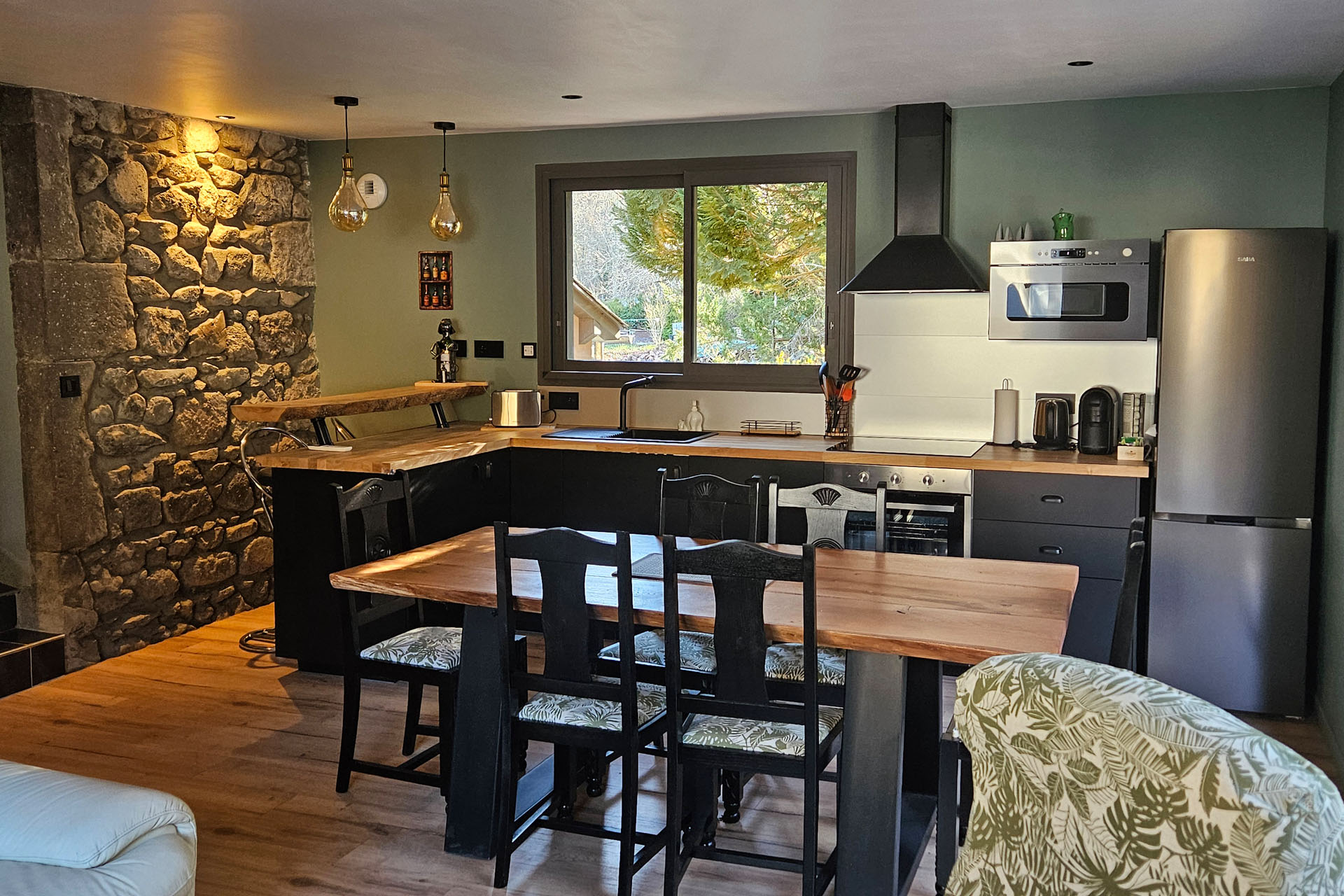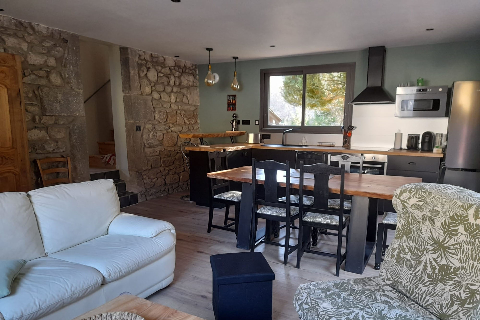 Une grande pièce à vivre avec cuisine aménagée; salle à manger et salon TV.