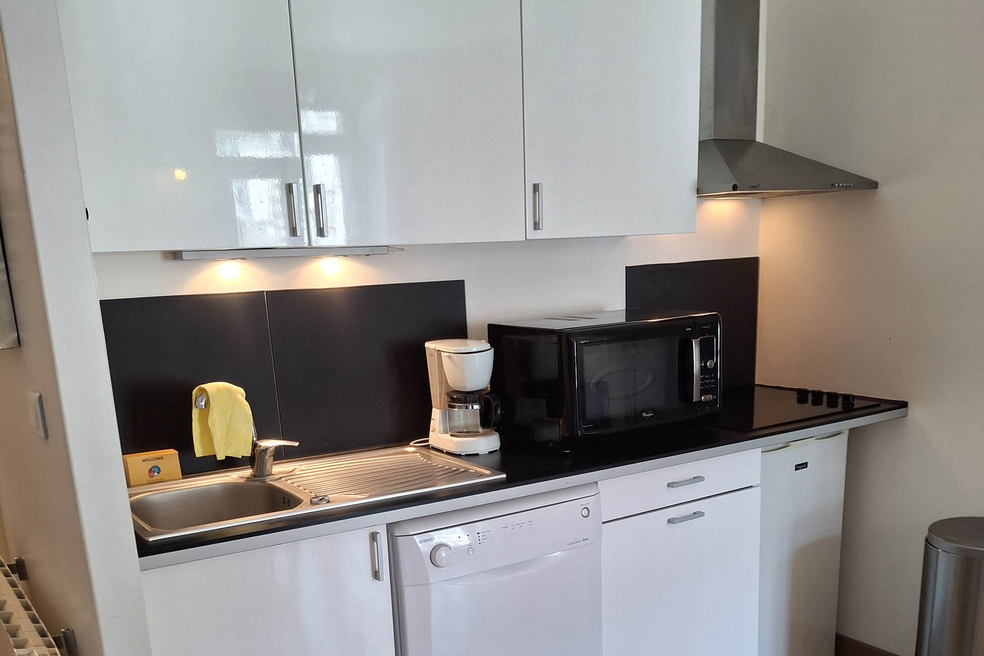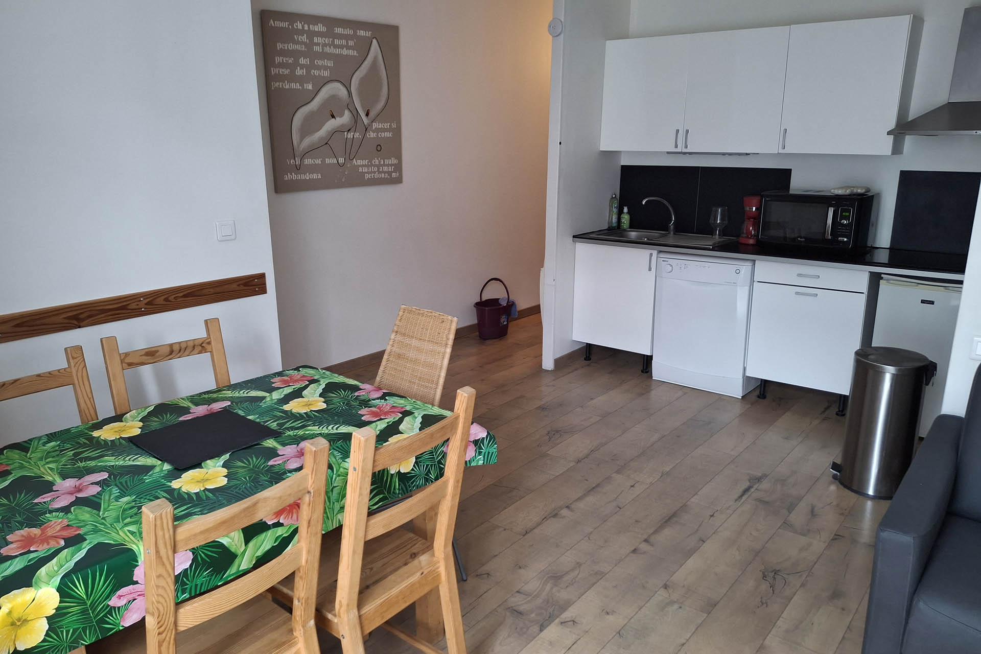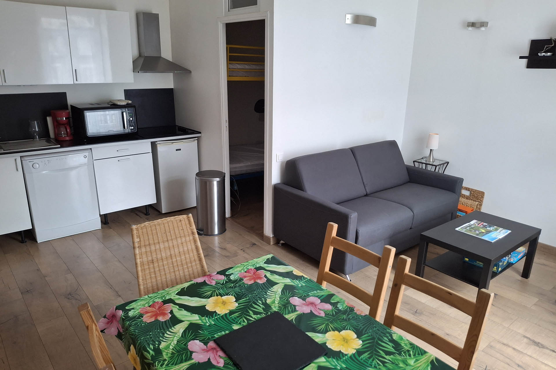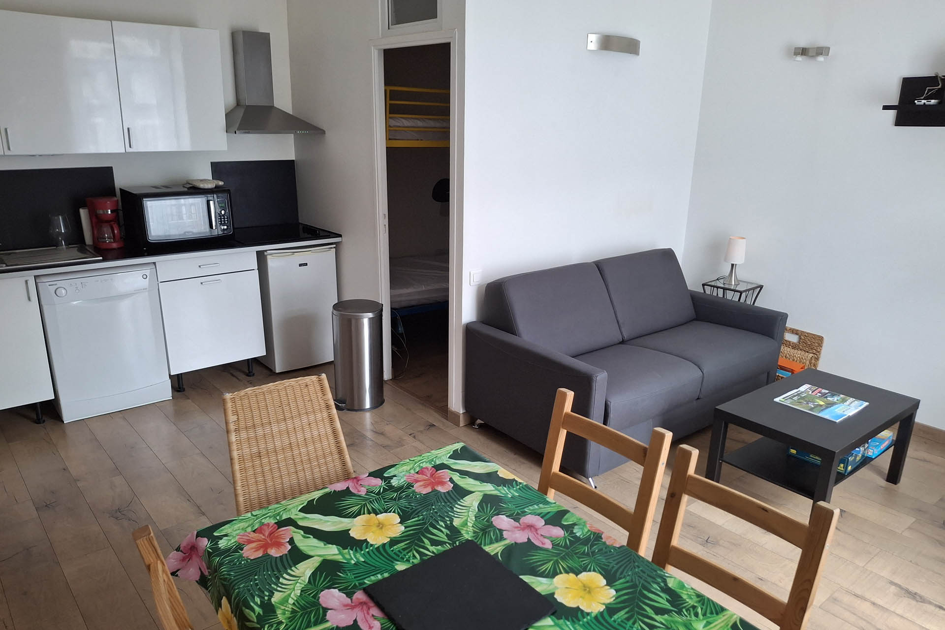 Cuisine équipée : lave-vaisselle, four grill et micro-ondes, réfrigérateur, plaque vitro, cafetière, bouilloire.