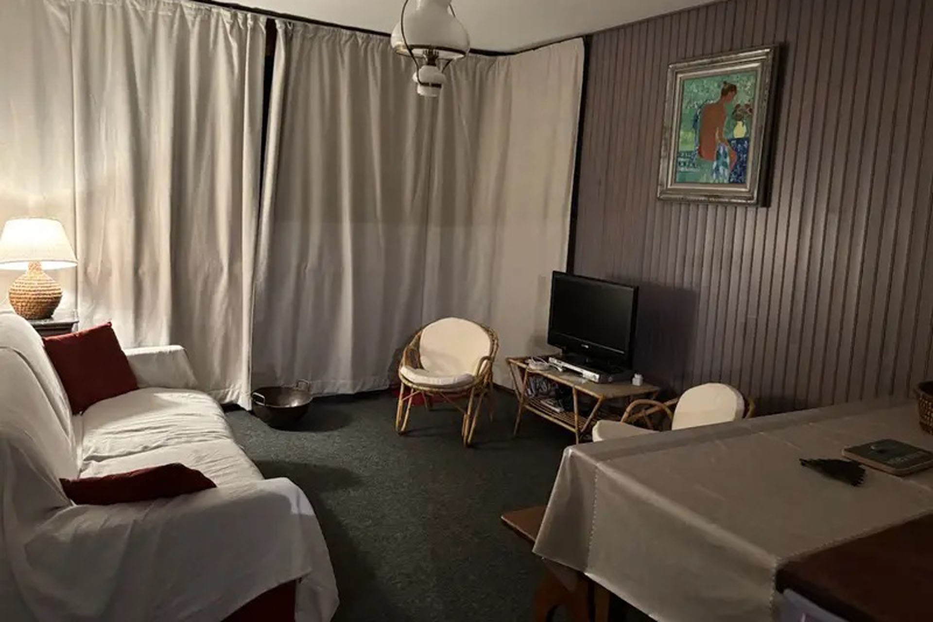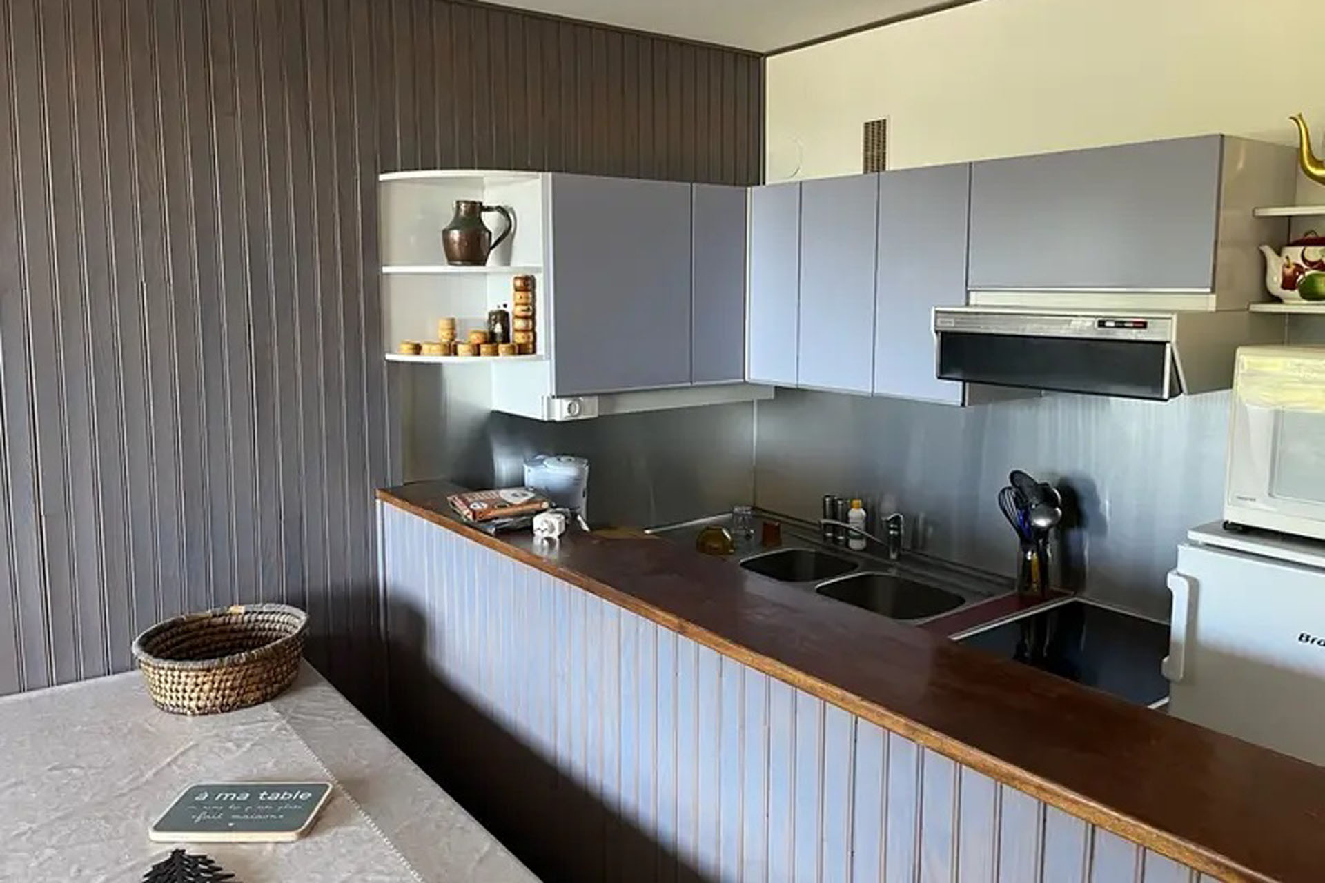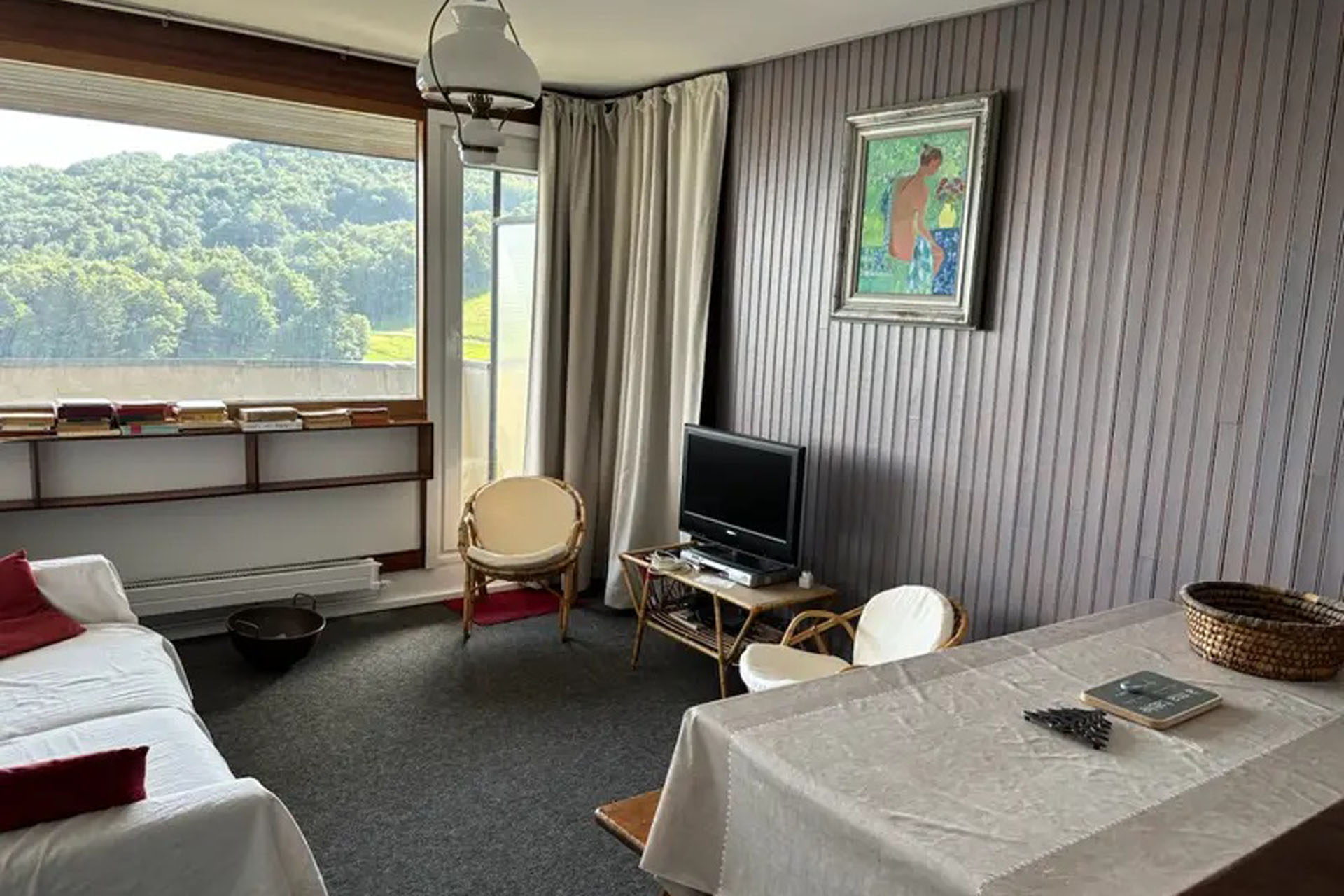 Entrée avec coffre à chaussures et commode à tiroirs, toilettes indépendantes, salle de bain avec baignoire-douche refermable, machine à laver le linge et sèche linge, éléments de rangement. Cuisine équipée et disposée à l’américaine donnant sur séjour, deux fauteuils et un canapé-lit neuf (140×190) pour deux personnes. Le séjour/salle à(…)