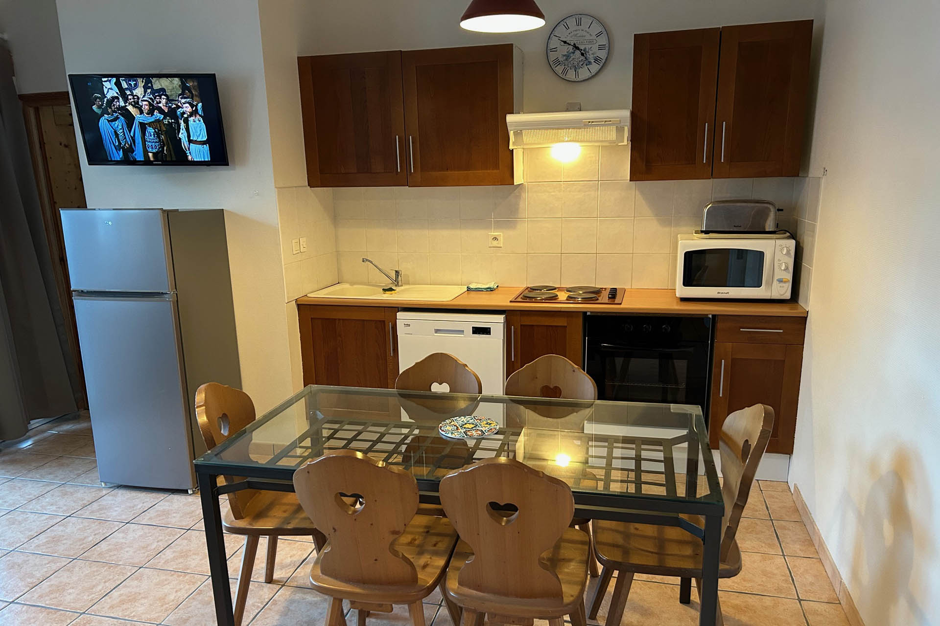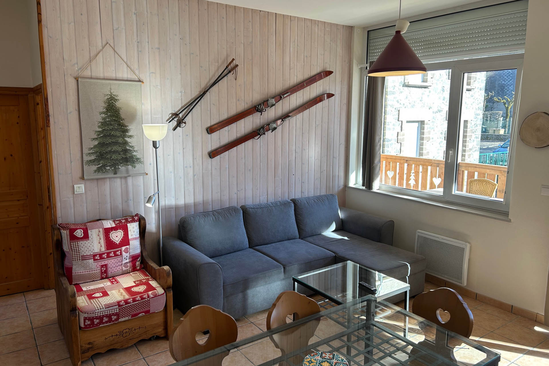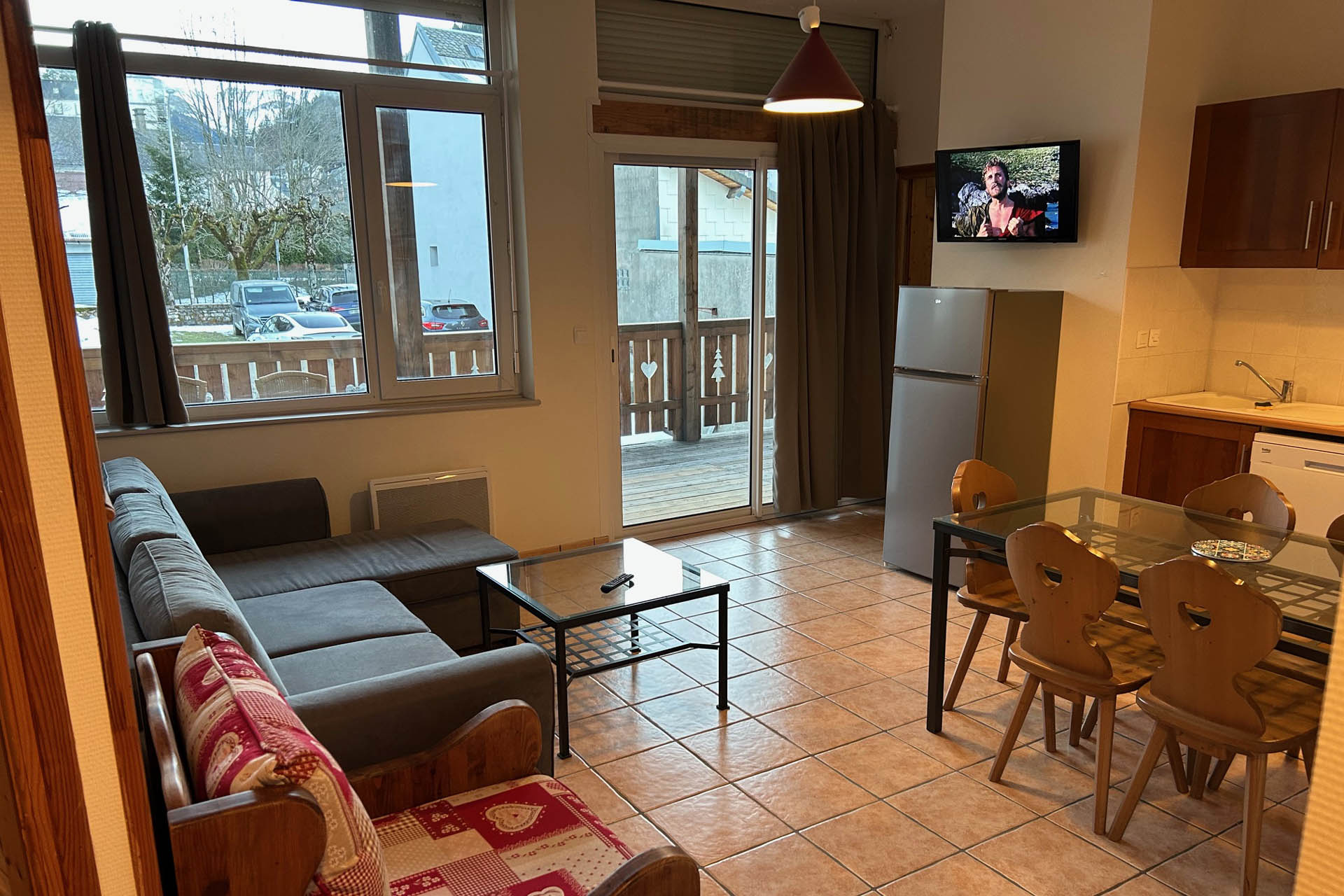 Résidence Les Chamois, Marmotte n°3 est un F3 au calme, très clair, avec 1 place de parking privative, une grande terrasse de 20m² avec table et chaises, plancha et vue dégagée sur le village et les montagnes, grande cour commune fermée pour les enfants