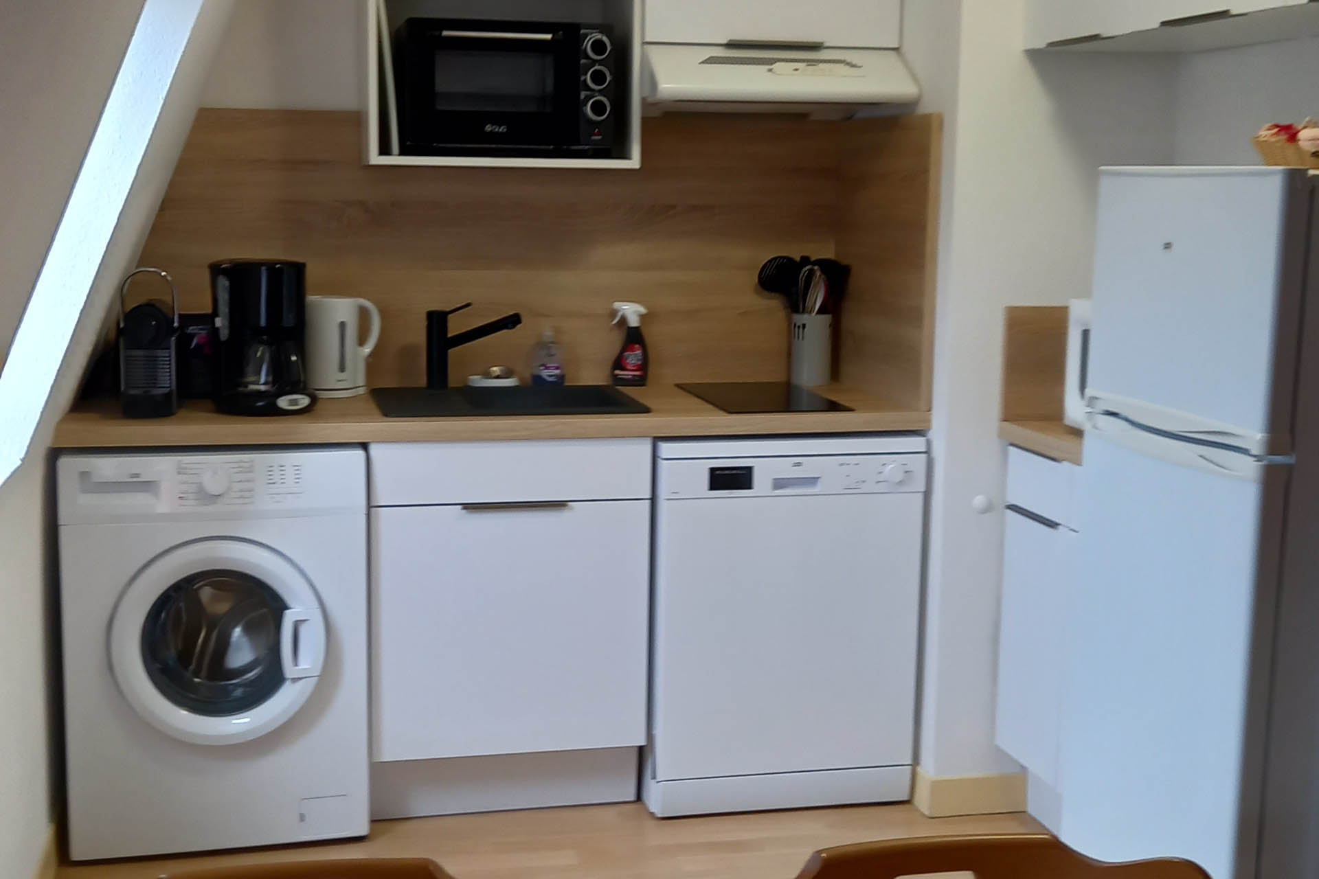 Loue beau 2 pièces cabines 6 couchages, au dernier étage au soleil couchant, 1 pièce à vivre avec coin cuisine équipé, salon avec deux couchages en banquette gigogne en 80.