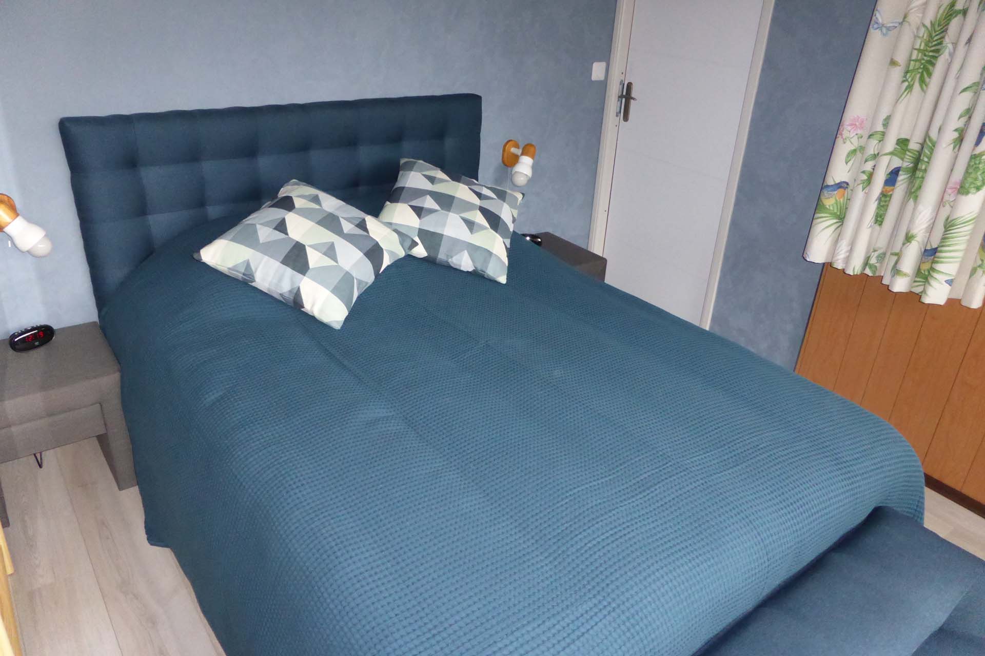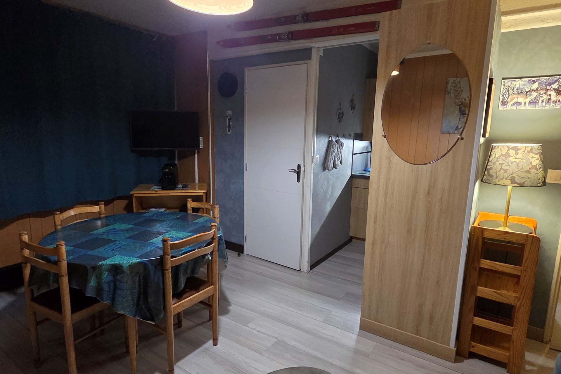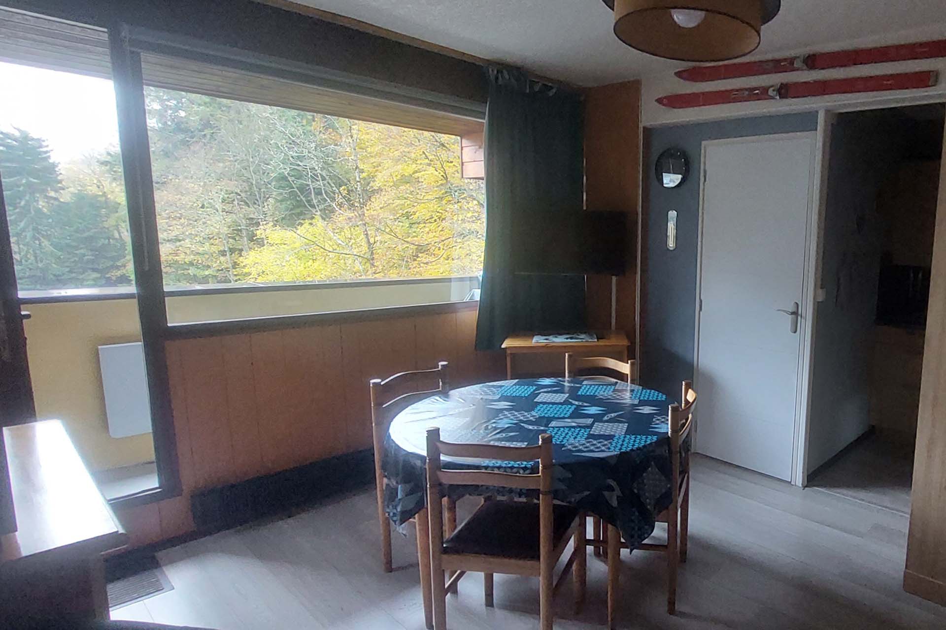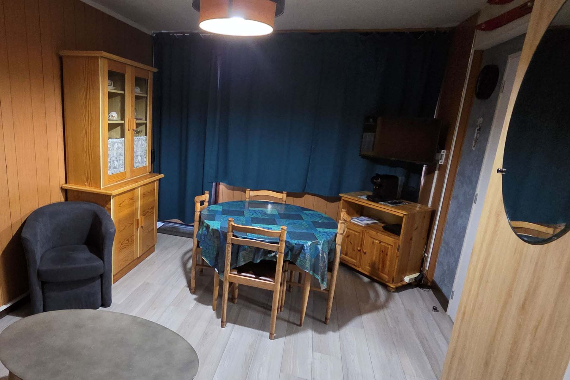 Une pièce de vie équipée de stores pare-soleil et de rideaux occultants, d’un canapé-lit avec un vrai matelas 140×190, une couette 220×240 et 2 oreillers, 1 TV, 1 radio CD, des jeux de société. Un vaisselier, 1 table et 4 chaises.