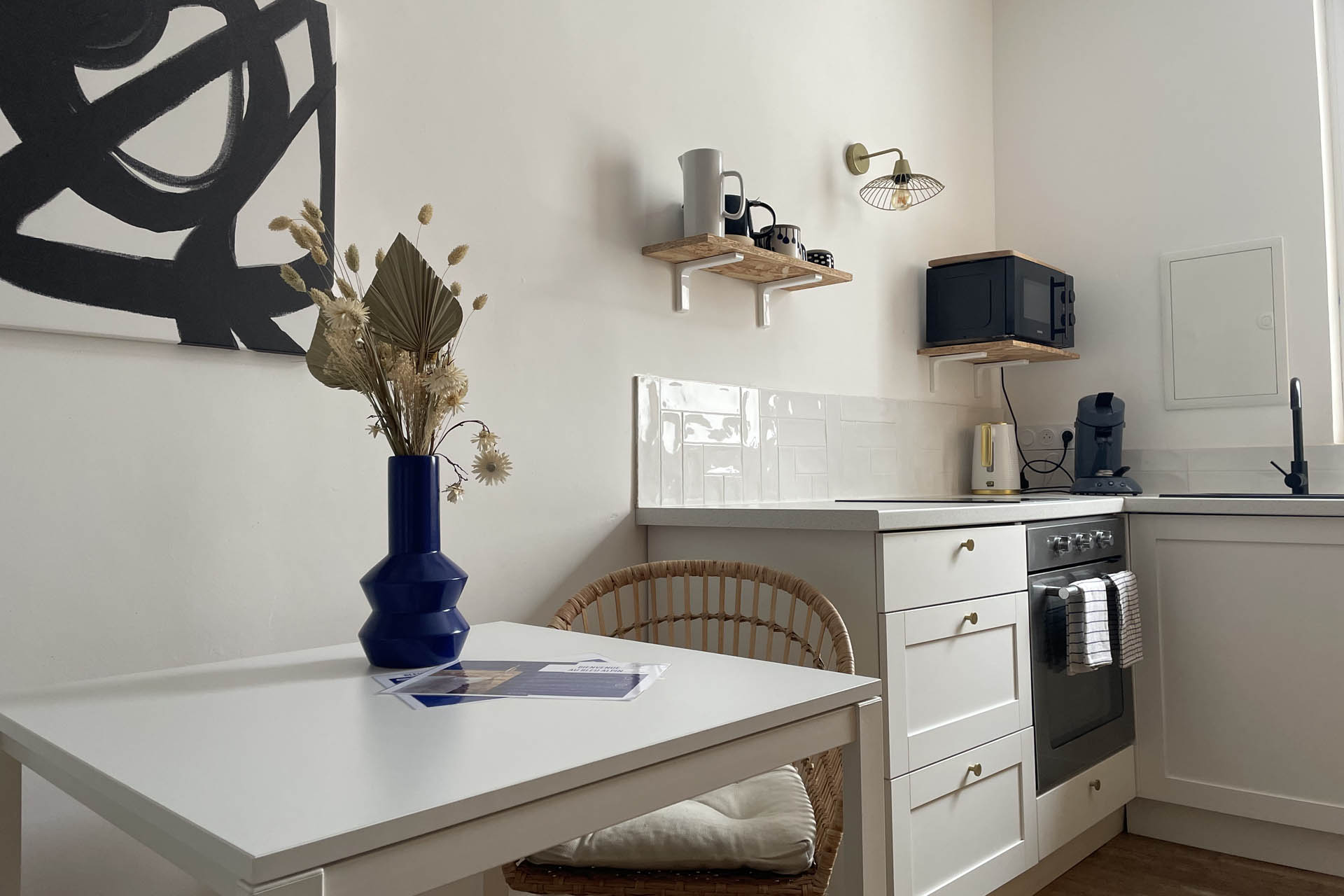 Espace cuisine : Complet et fonctionnel avec Senseo, plaques, four, micro-ondes,(…)