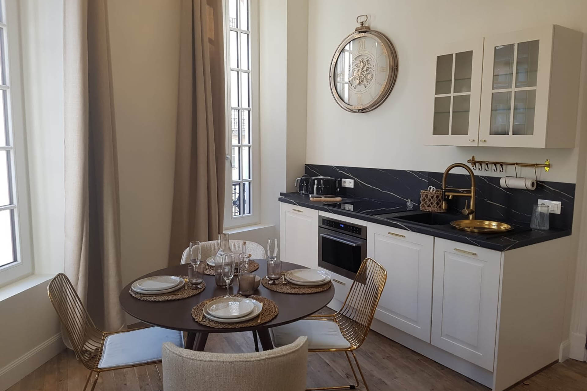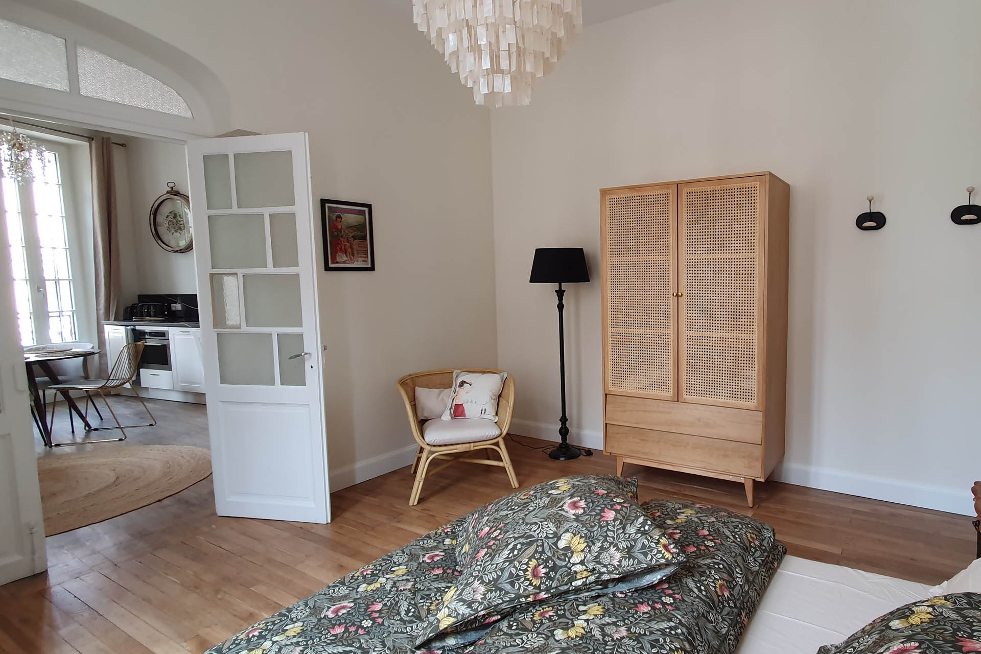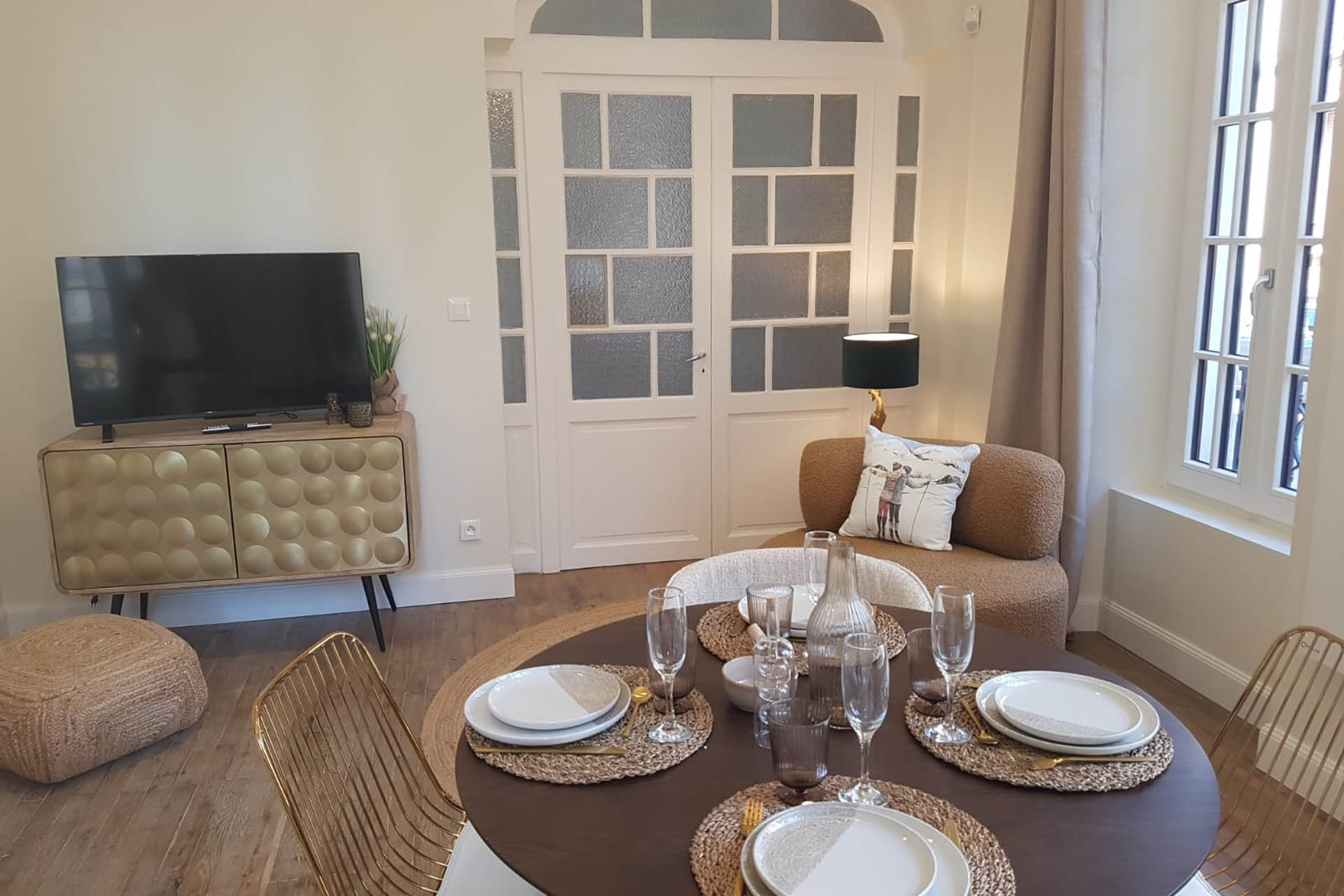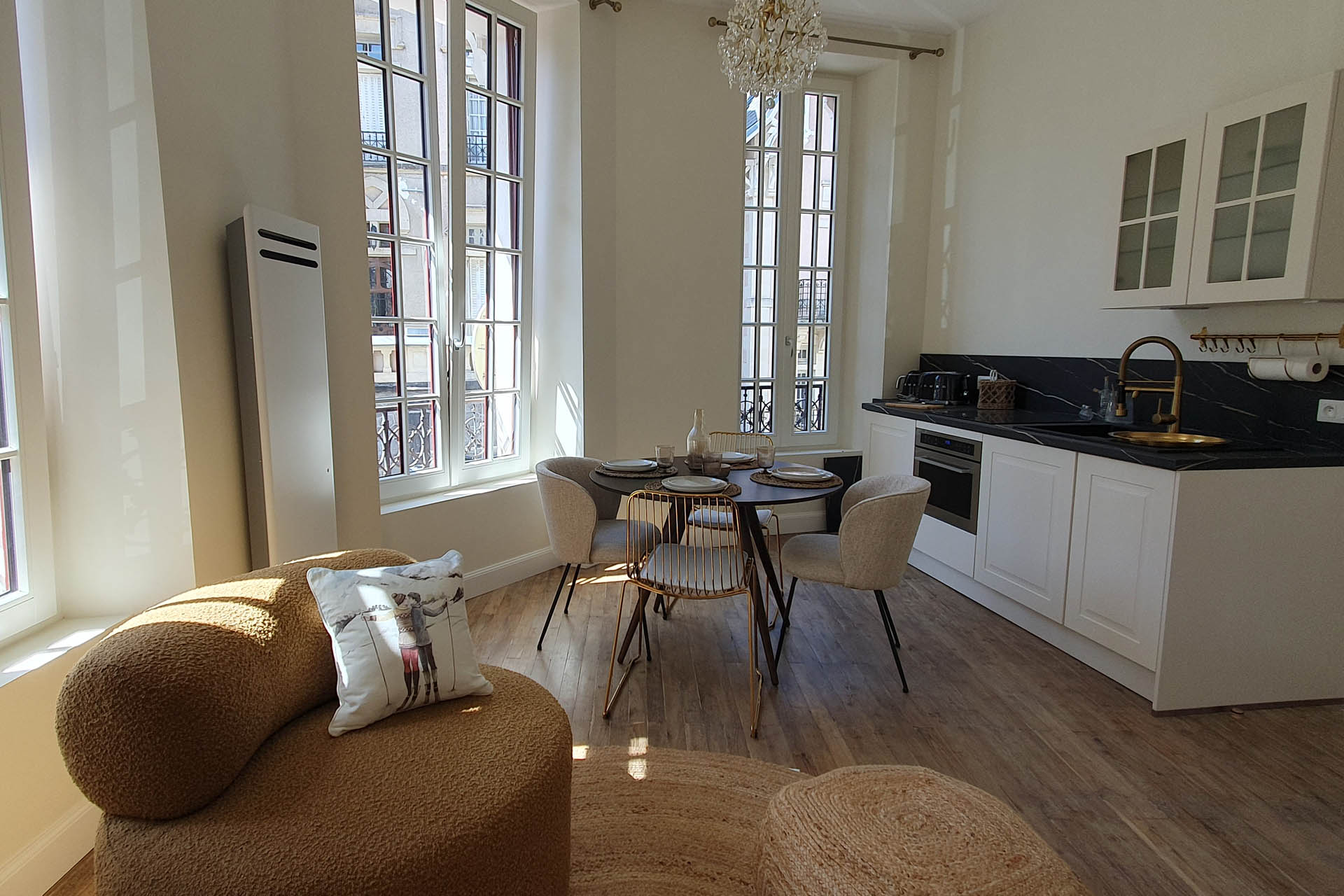 À seulement 100 mètres des Grands Thermes, la Villa Charlotte vous ouvre les portes d’un univers où luxe et sophistication se conjuguent avec subtilité. Inspiré par l’esprit glamour et festif de l’époque Gatsby, cet appartement lumineux allie charme vintage et confort moderne pour une expérience unique.