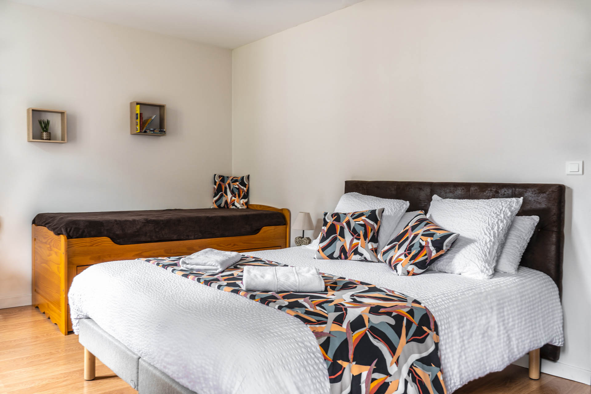 Elle dispose d’un lit double de 160×200 (ou 2×80 sur demande) et d’un lit gigogne de 90×190, idéale pour un couple ou une petite famille.