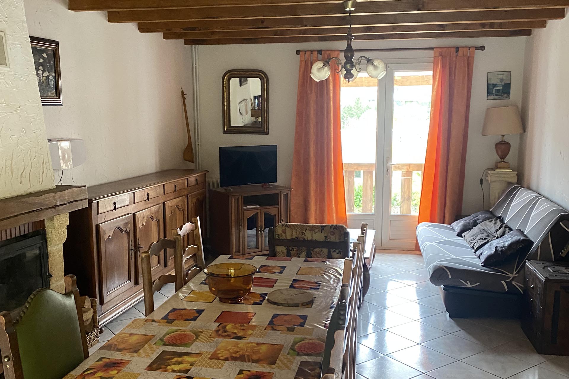 Insère cheminée dans la pièce à vivre, parking gratuit devant la maison.