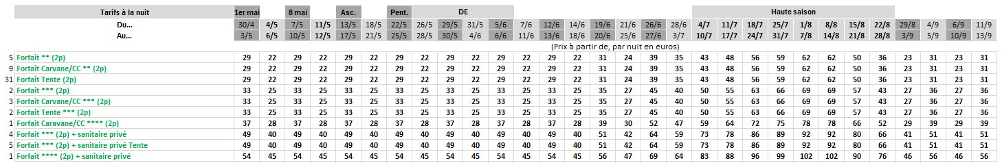 Forfait : de 22 à 99 € (base 2 pers/jour, 1 emplacement, 1 voiture + électricité.)