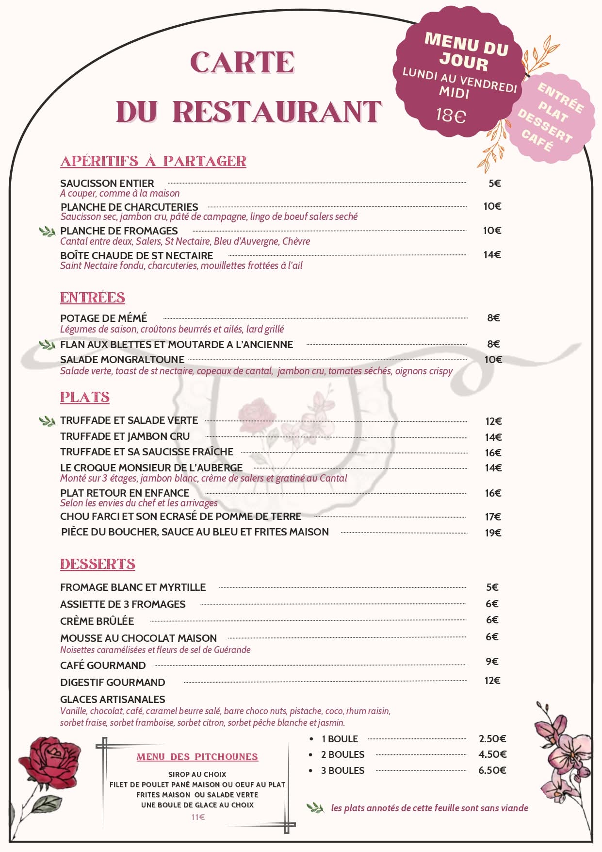 Nous mettons un point d’honneur à vous proposer une cuisine maison, généreuse et réconfortante, inspirée des traditions auvergnates. Truffade, chou farci, saucisse de pays, fromages de caractère, desserts gourmands… Chaque plat met en valeur les produits locaux et de saison, issus de producteurs du coin.