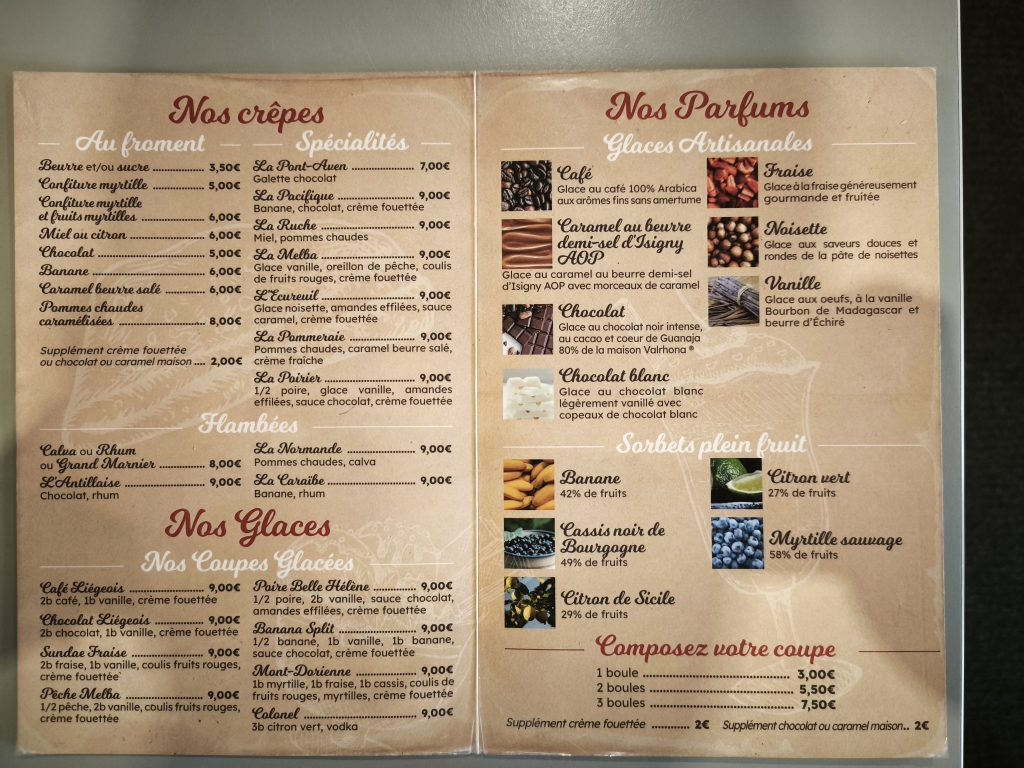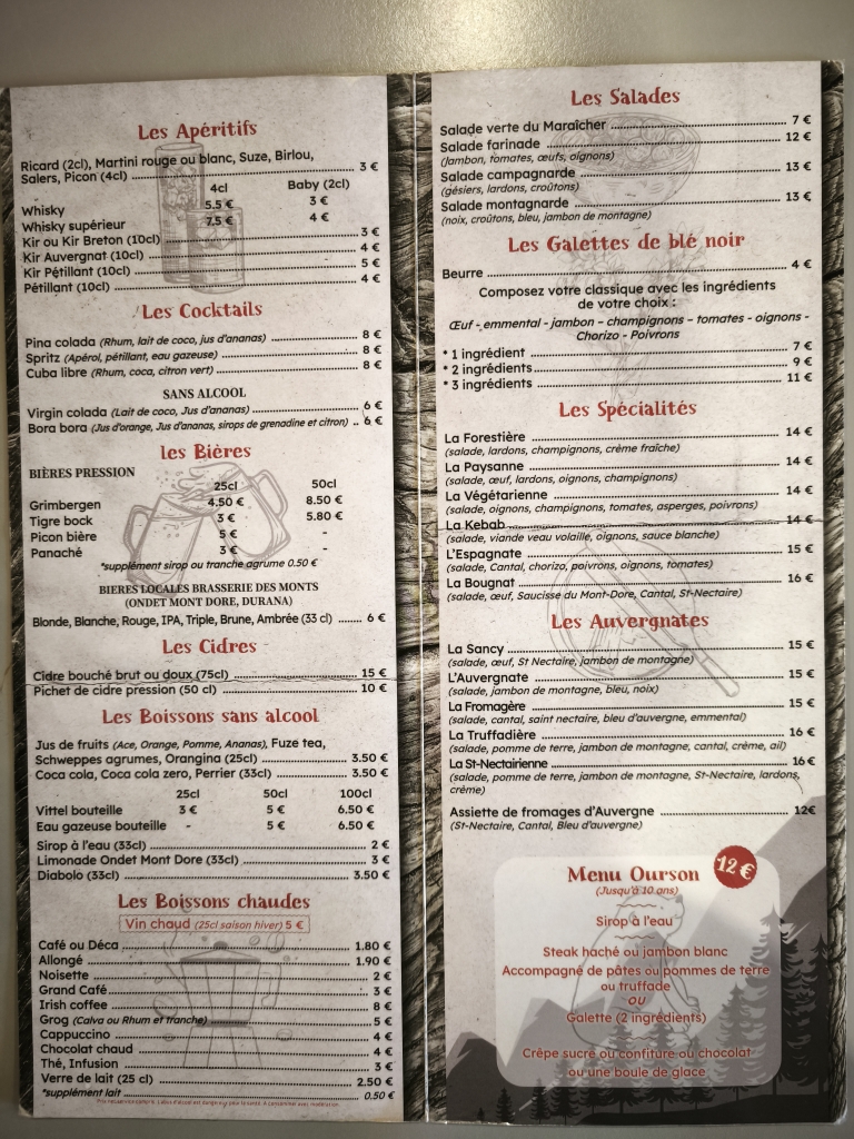 Menu Ourson proposé jusqu’à 10 ans pour découvrir la Bretagne mais aussi l’Auvergne! Les enfants dégusteront une galette accompagnée de pommes de terre ou même de truffade de quoi éveiller leurs papilles. Et en dessert une crêpe sucrée ou une boule de glace. Le sirop est en cadeau!