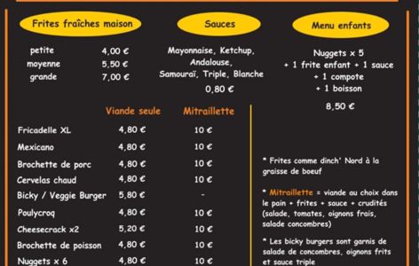 Frites maison à la graisse de bœuf, mitraillettes, fricadelles, brochettes et autres snacks, burgers et croquettes belges.